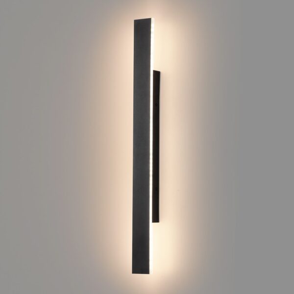 Модерен външен аплик с изчистен вертикален дизайн и черен корпус. Създава равномерен светлинен ефект по стената и подчертава архитектурните линии на сградата.