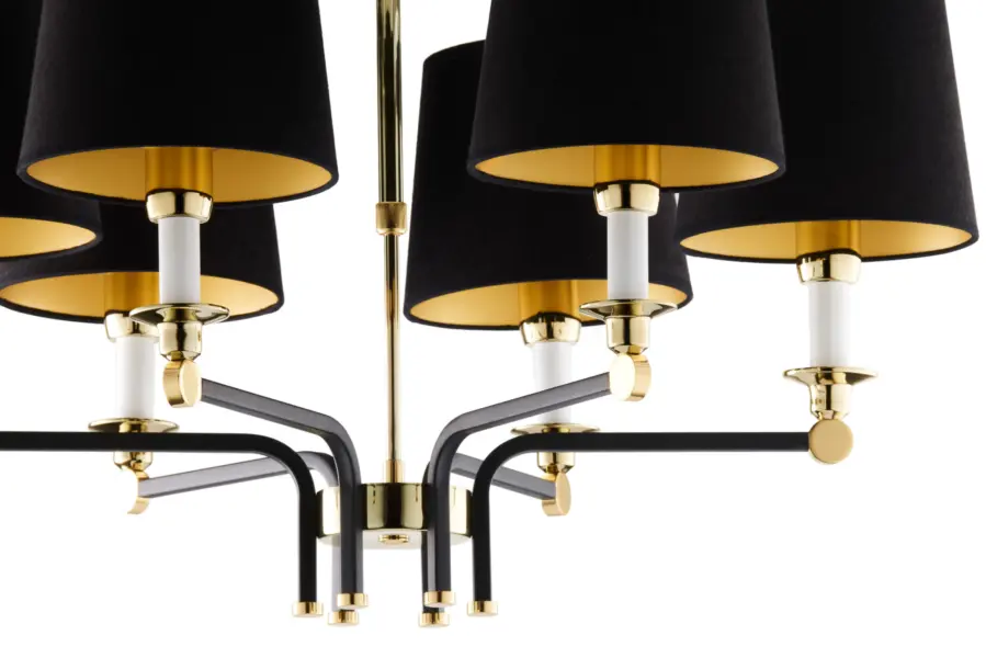 Металният корпус гарантира здравина и дълготрайност, като предпазва осветителното тяло и осигурява сигурна инсталация. Текстилният абажур добавя допълнителен естетичен и топъл ефект, разпръсквайки светлината равномерно и създавайки уютна атмосфера.