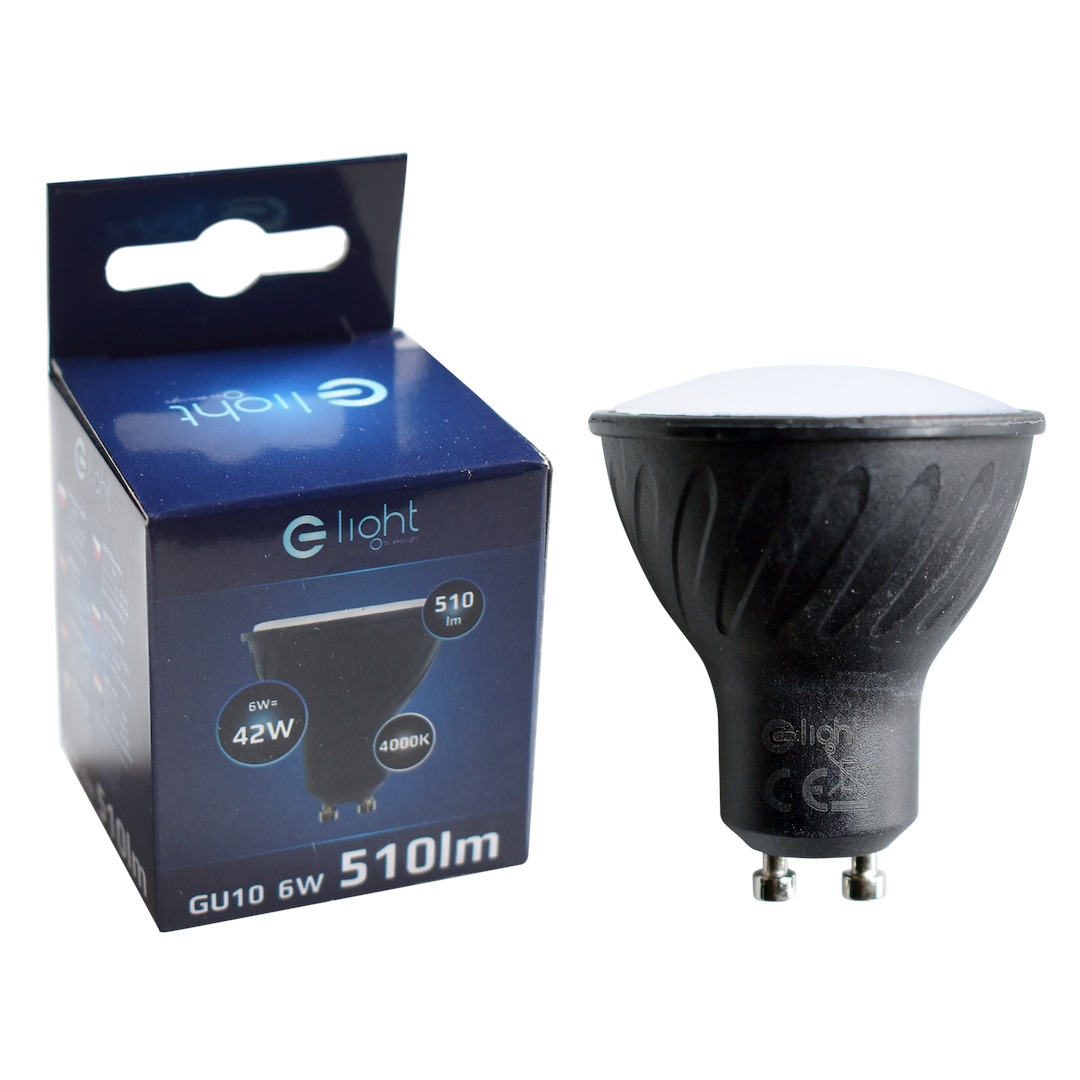 LED крушка GU10 6W EKO-LIGHT EKZA268 с неутрална светлина 4000K и светлинен поток 510 lm. Подходяща за лунички и спот осветление, с модерен черен корпус и ниска консумация на енергия