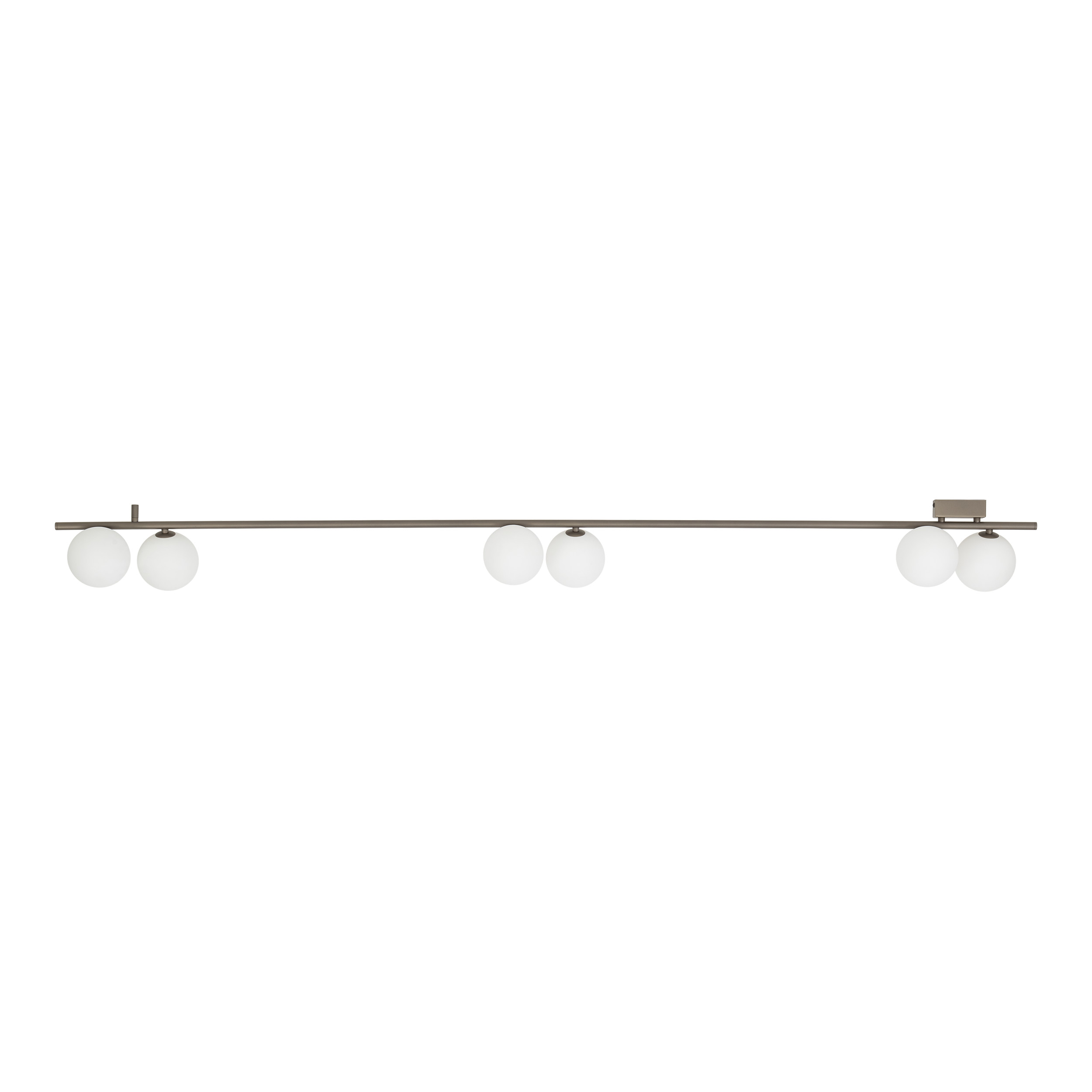 Плафонът IMELO в кафяв цвят е издължено таванно осветително тяло с метална конструкция и шест стъклени абажура в бял цвят. Дългата линия на корпуса позволява равномерно разпределение на светлината, което го прави подходящ за просторни дневни, трапезарии, кухни и обществени пространства.