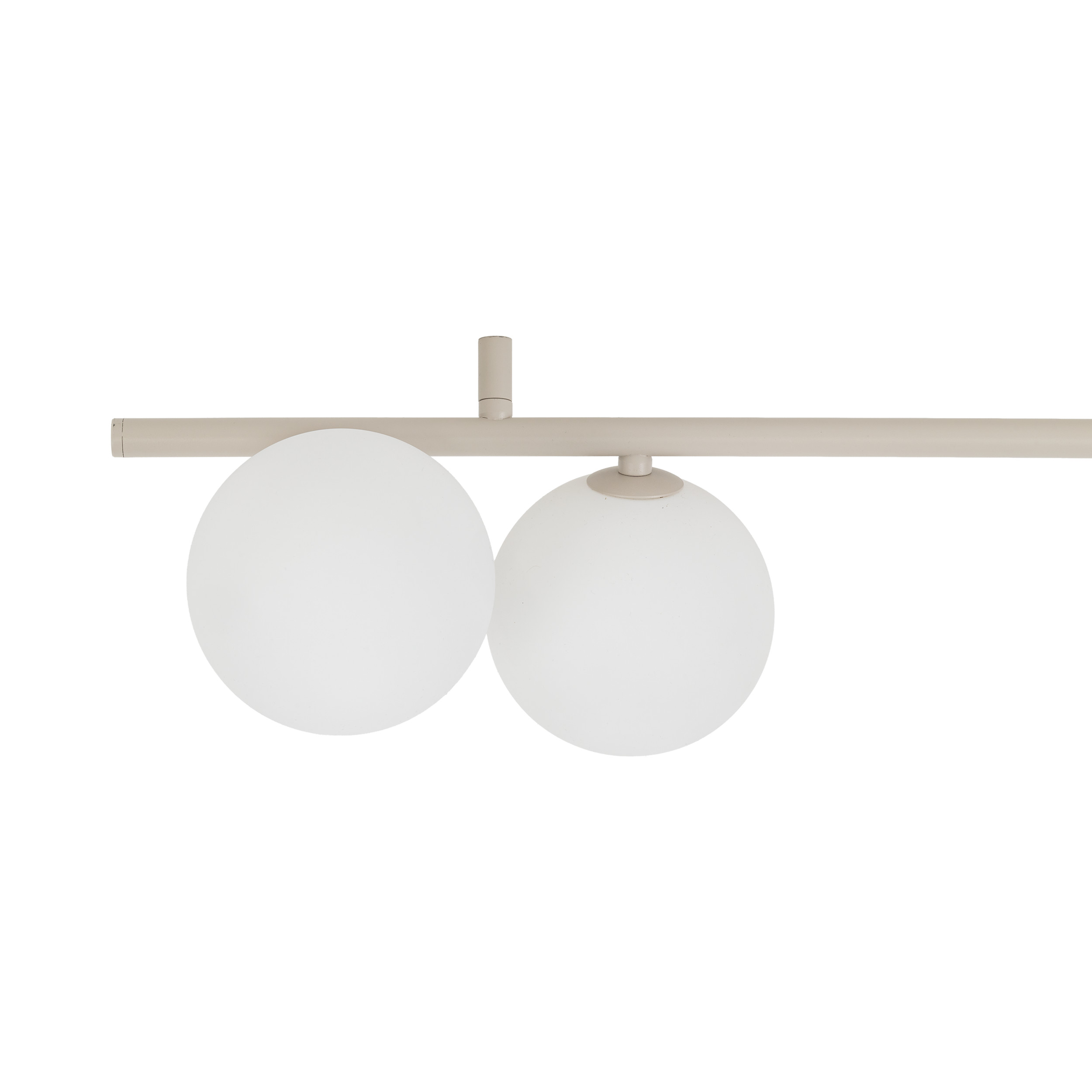 Модерен плафон IMELO в цвят кашмир с шест фасонки G9 и сферични бели абажури. Подходящ за просторни помещения и съвременни интериори.