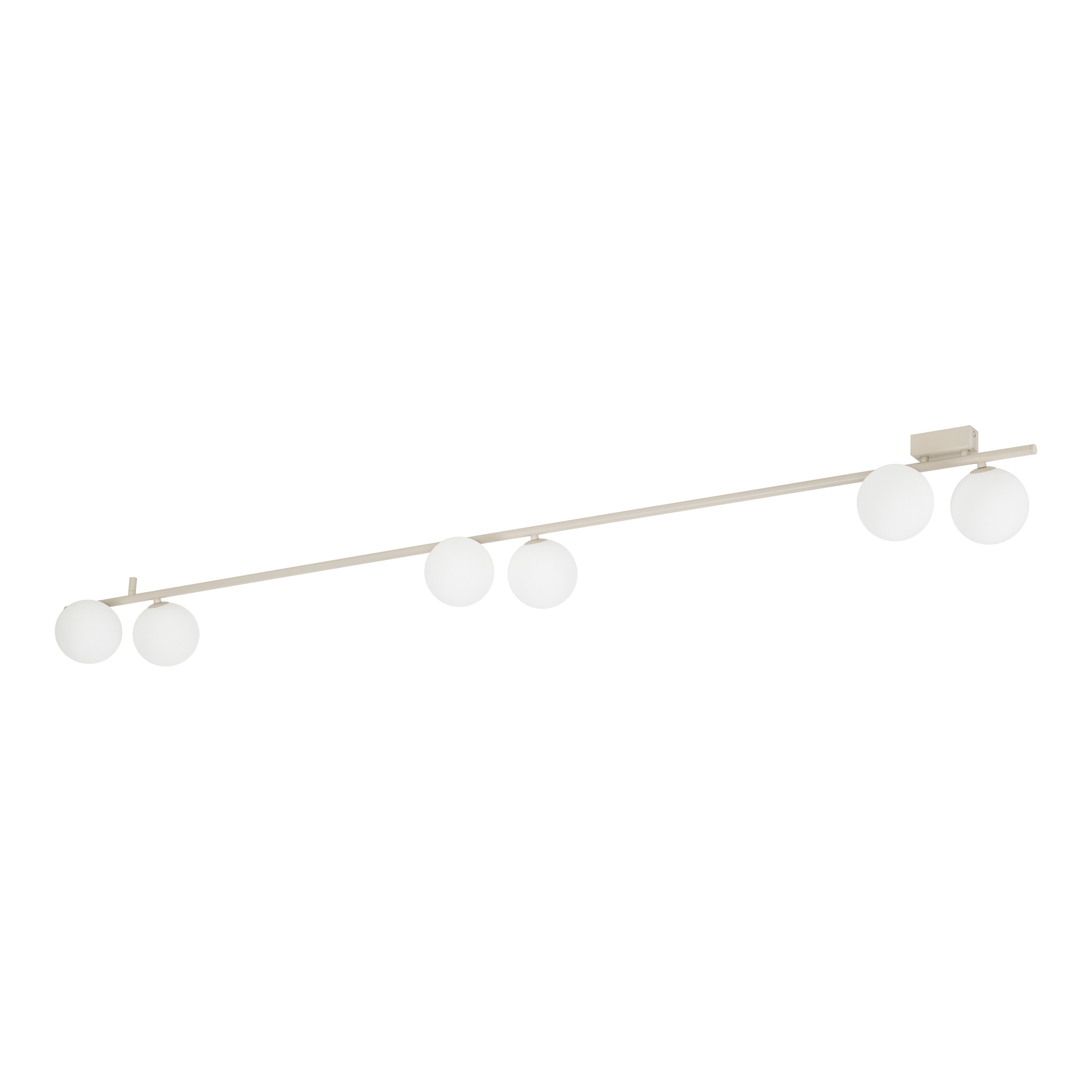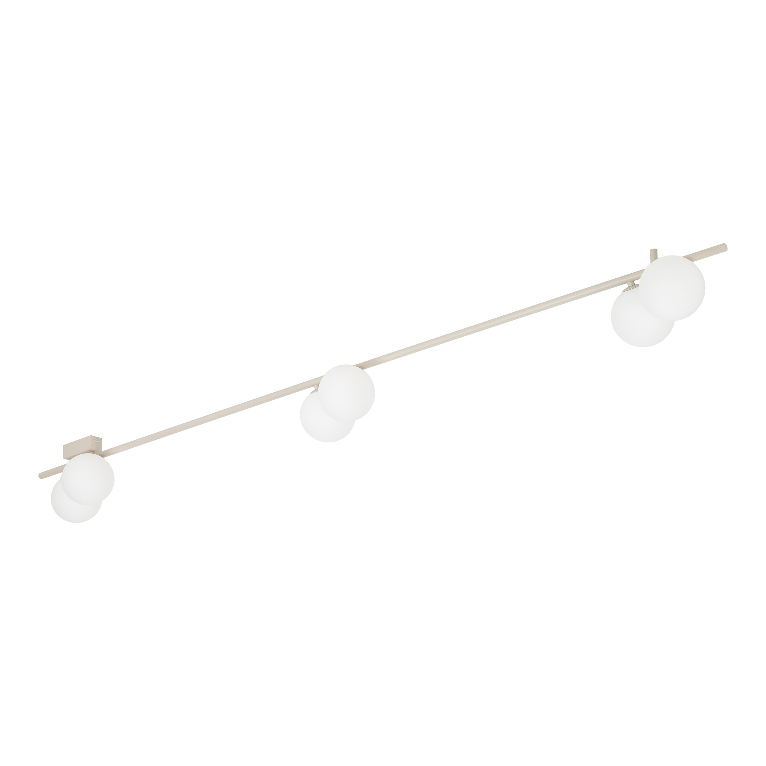 Плафонът IMELO в цвят кашмир е издължено таванно осветително тяло с метална конструкция и шест стъклени абажура в бял цвят. Дължината от 2000 mm позволява равномерно разпределение на светлината в по-големи помещения като дневни, трапезарии, кухни и обществени пространства.