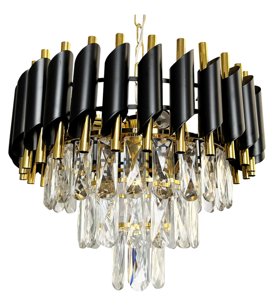 Елегантен кристален полилей с модерен дизайн, съчетаващ черен метал, златисти акценти и декоративни кристали. Подходящ за всекидневни, трапезарии, спални и представителни интериори, където се търси луксозно и ефектно осветление.