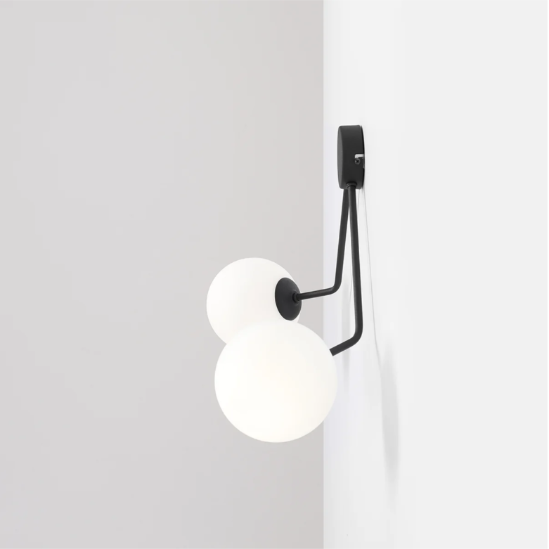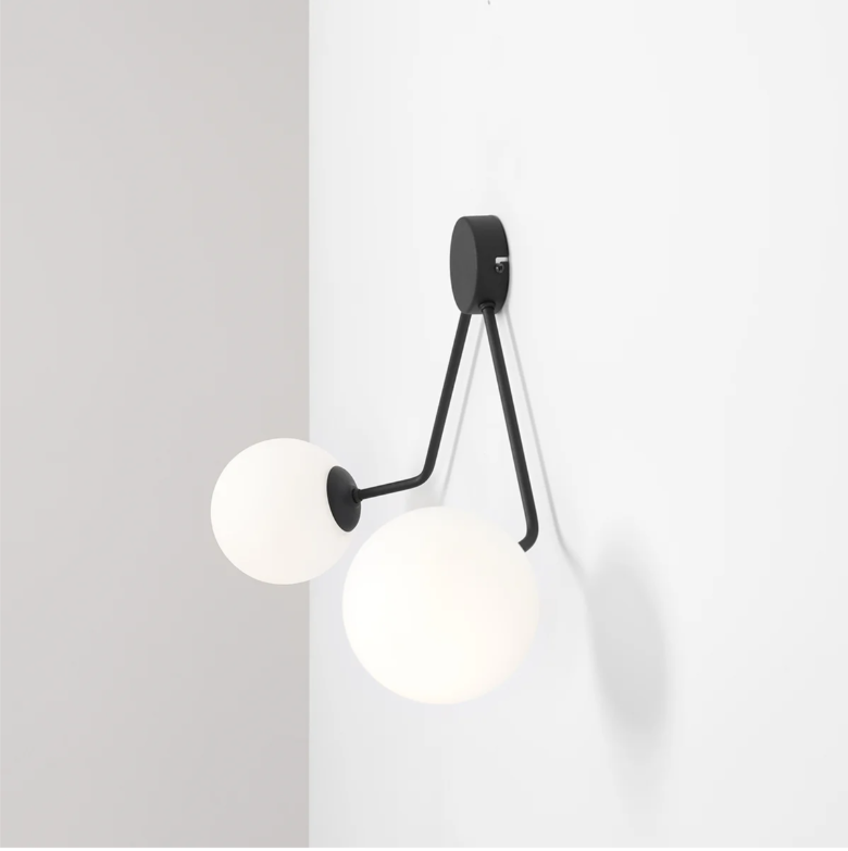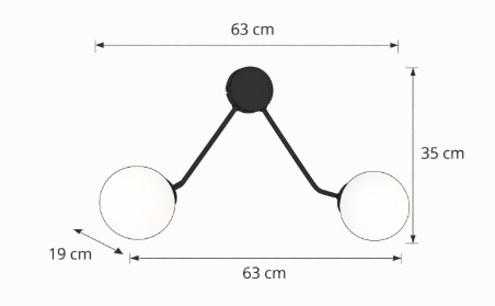 Металната конструкция в черен цвят придава модерен вид, а стъклените абажури с диаметър 14 см добавят нежност и прозрачност на светлината. Компактните размери – дълбочина 19 см, ширина 63 см и височина 35 см – позволяват лесно интегриране в различни интериори, без да заемат излишно пространство.