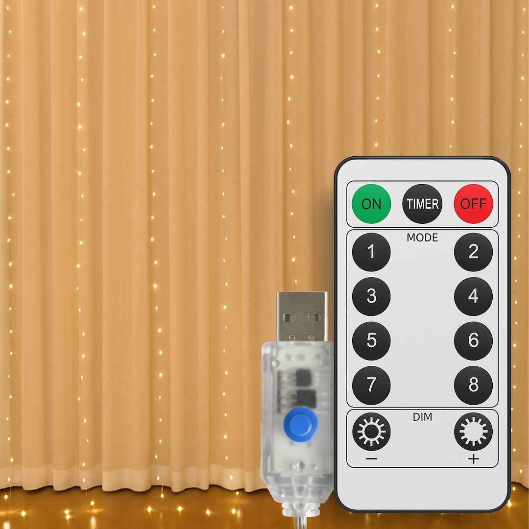 Светлинна завеса MERY с 300 топло бели LED светлини (3000K), размер 3х3 метра, USB захранване, дистанционно управление и 8 режима на светене. Перфектна за декорация на прозорци, завеси и стени.