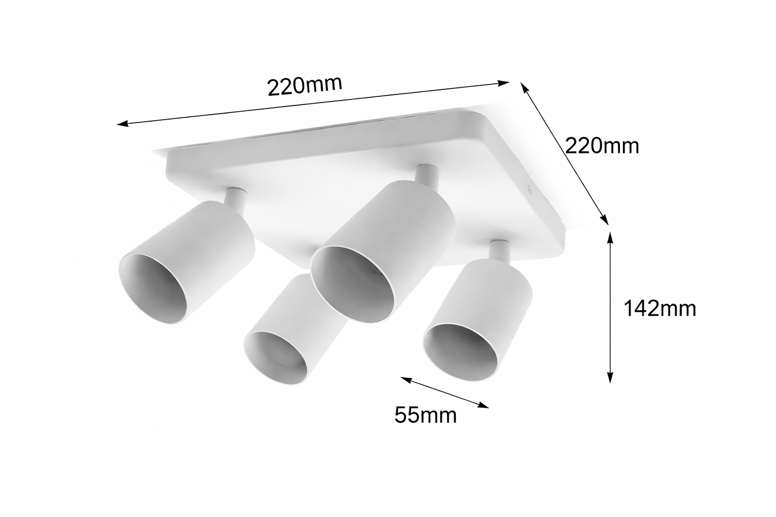 Спот с четири фасонки GU10, алуминиев корпус в бял цвят и степен на защита IP20. Подходящ за интериорно осветление.