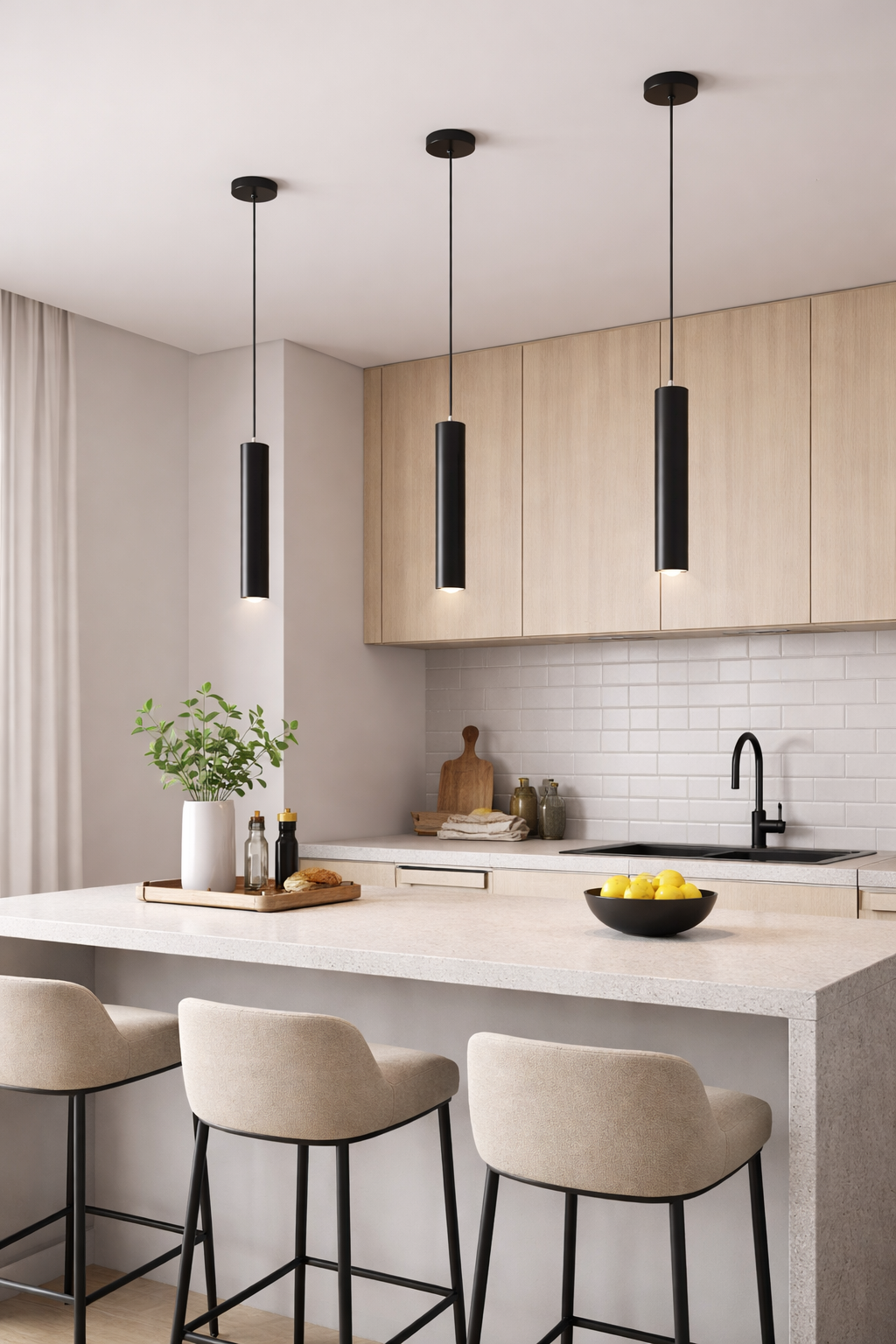 Модерна висяща лампа с цилиндричен дизайн от алуминий, предназначена за една крушка GU10. Подходяща за осветление на кухня, трапезария, бар плот или модерни интериори.