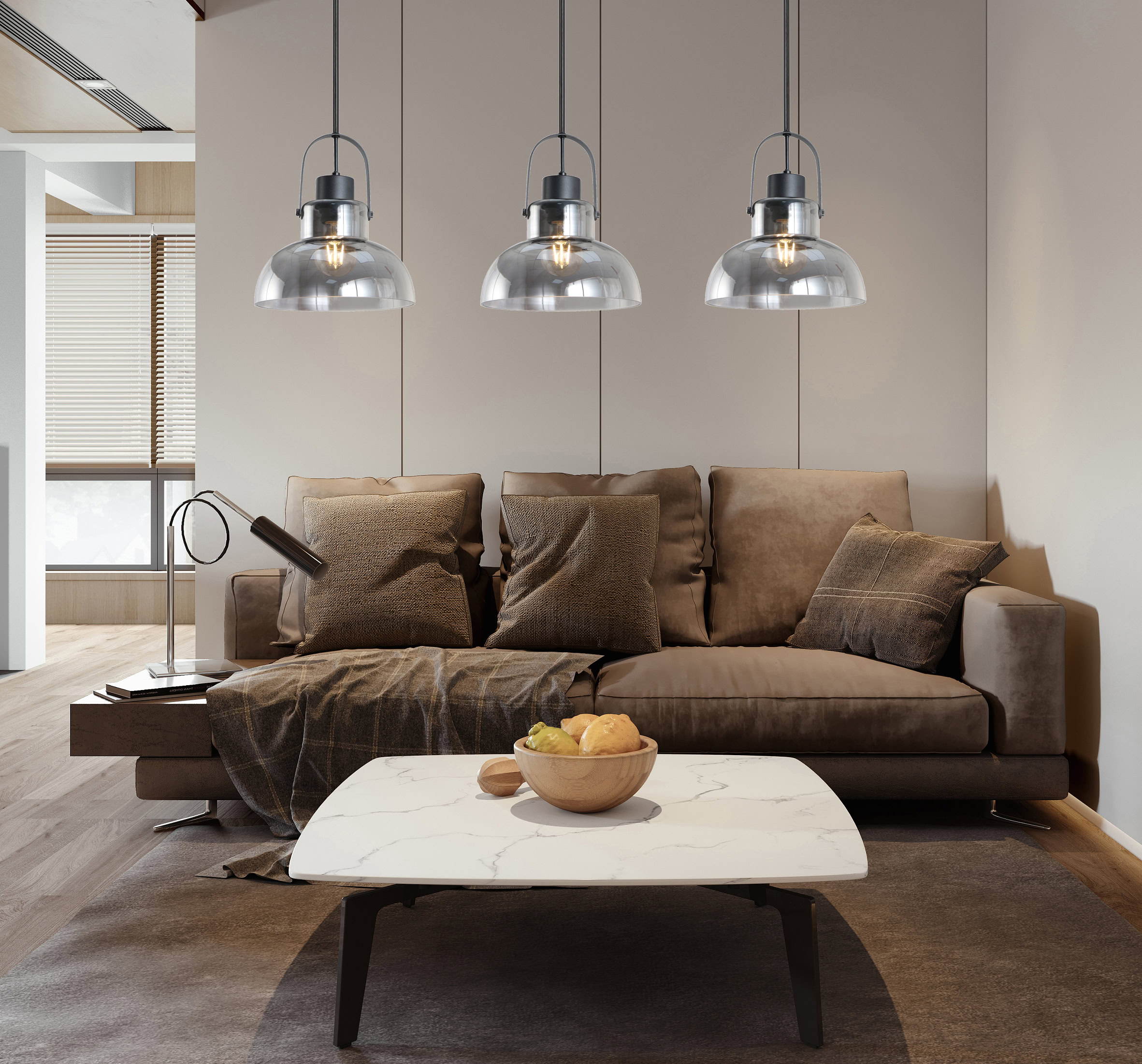 Висящата лампа Dijon от REALITY е модерно осветително тяло с три светлинни източника E27. Изработена от метал и стъкло в черен, леко опушен цвят. Подходяща за осветление над маса, кухненски остров или дневна. Височината е регулируема до 120 см. Лампата се доставя без крушки и позволява използване на LED източници.
