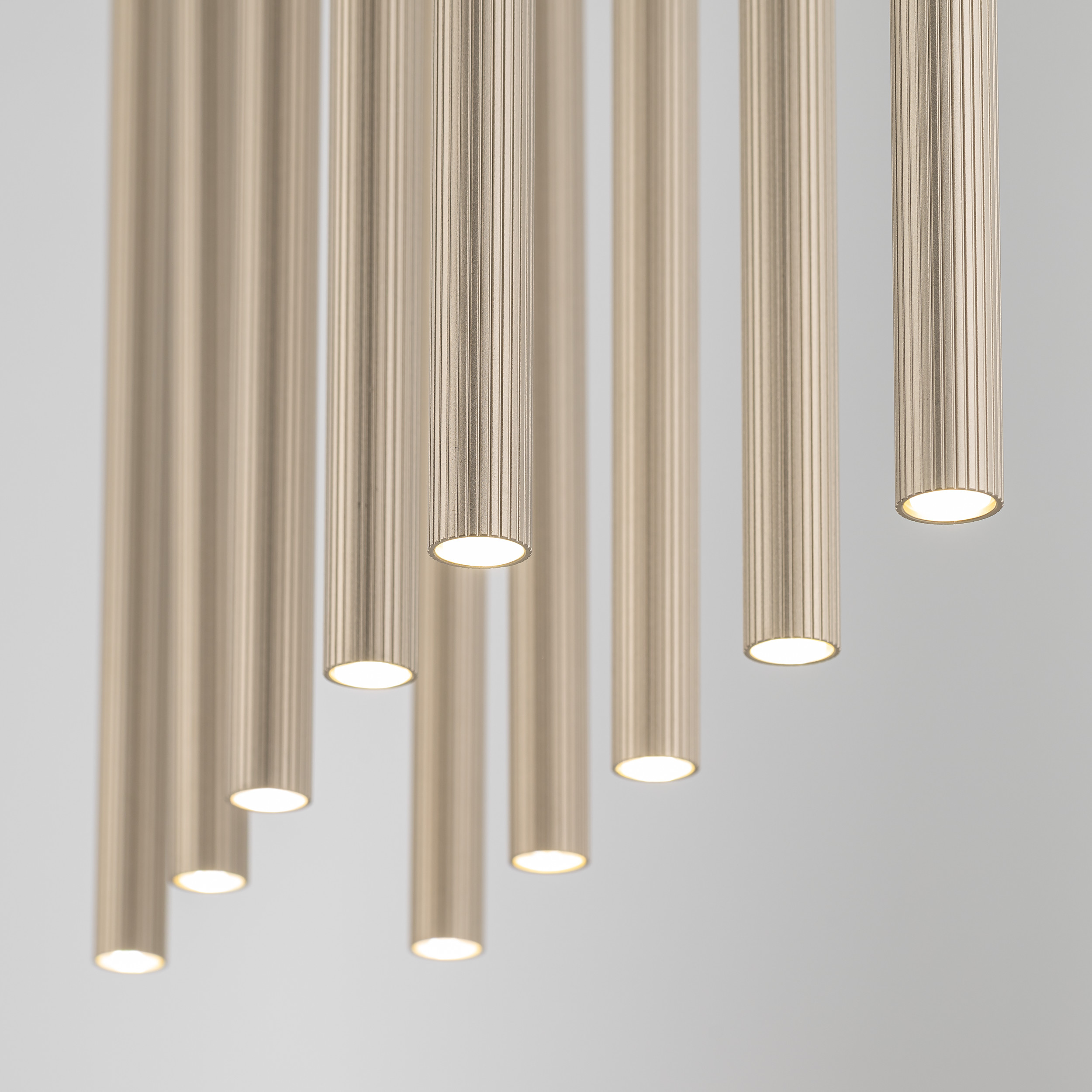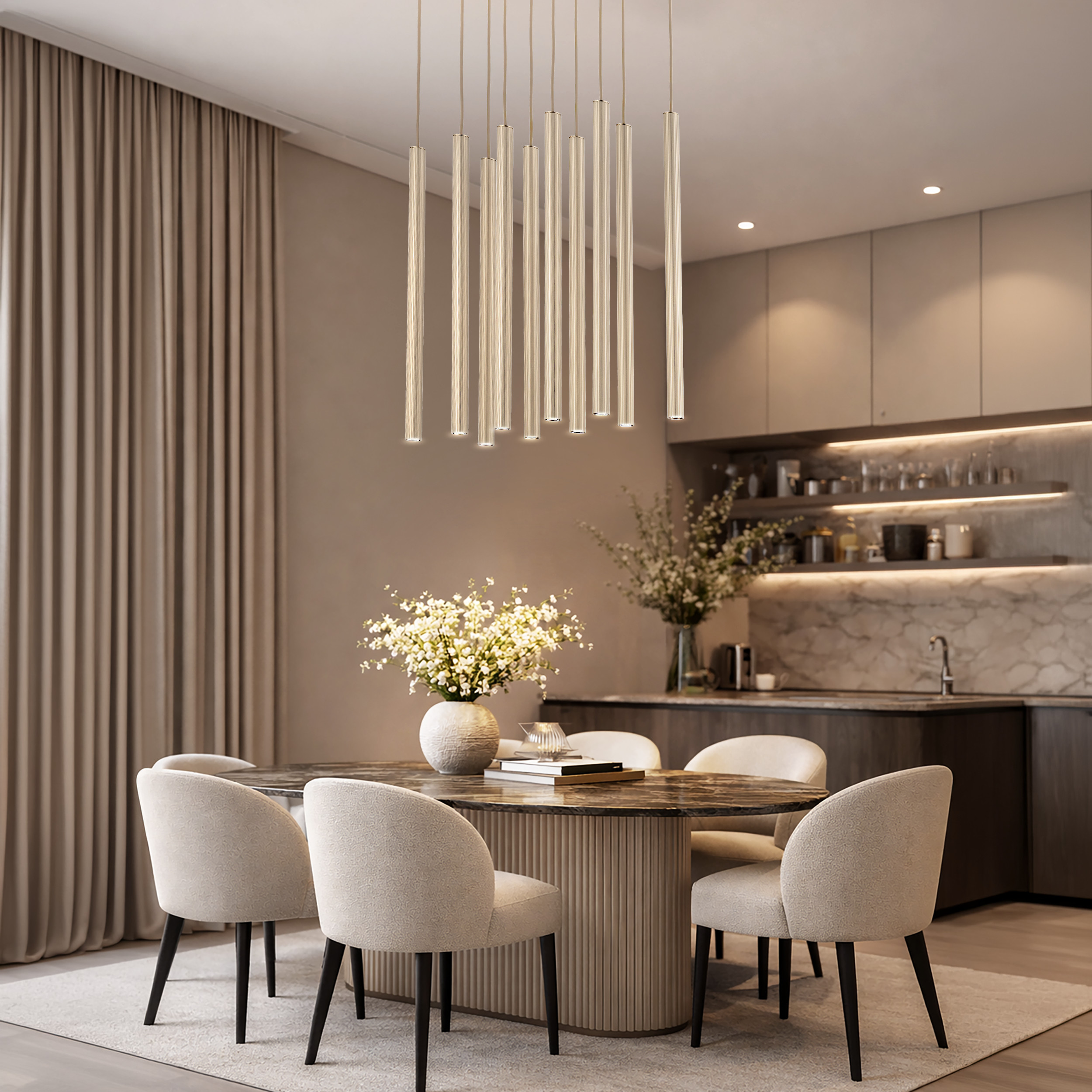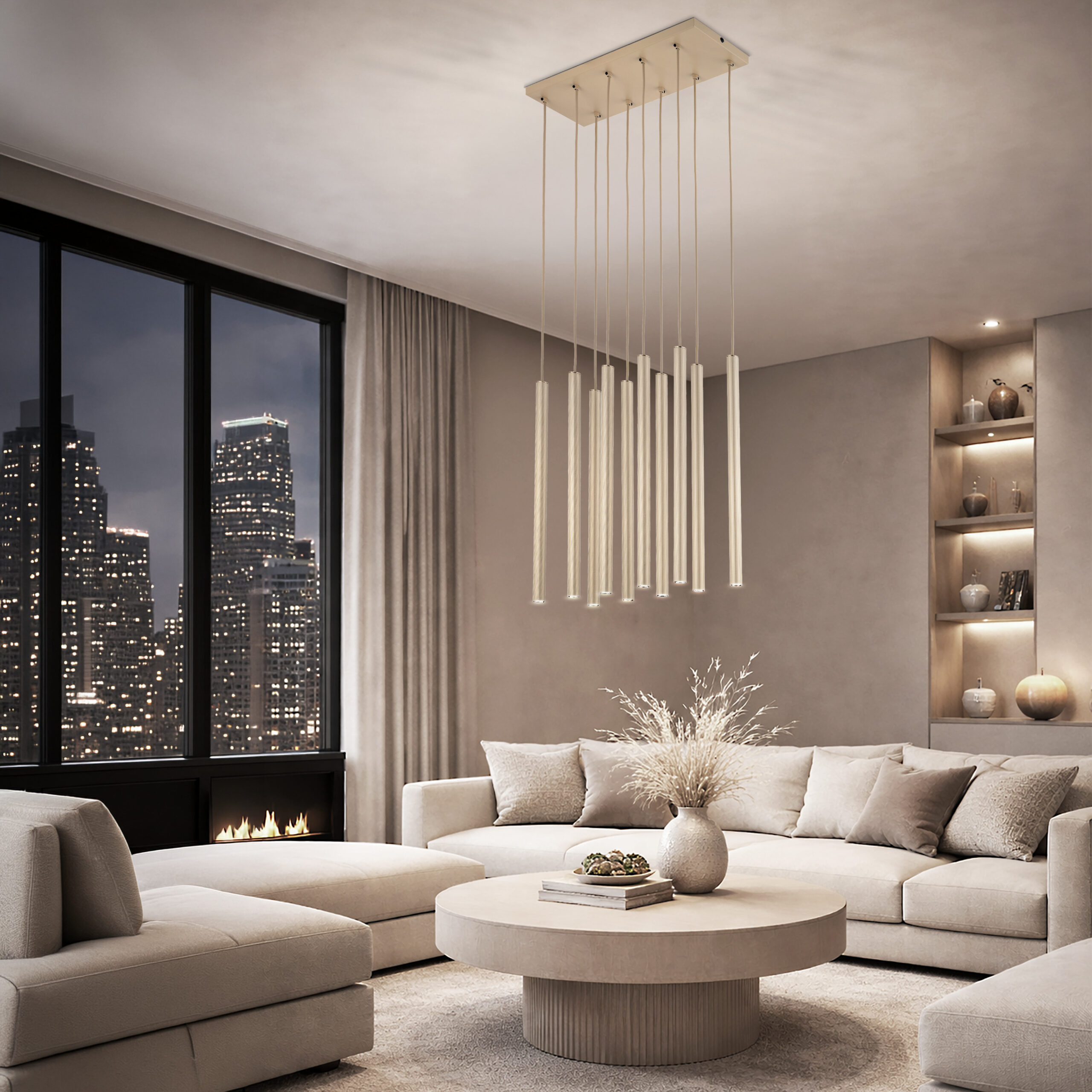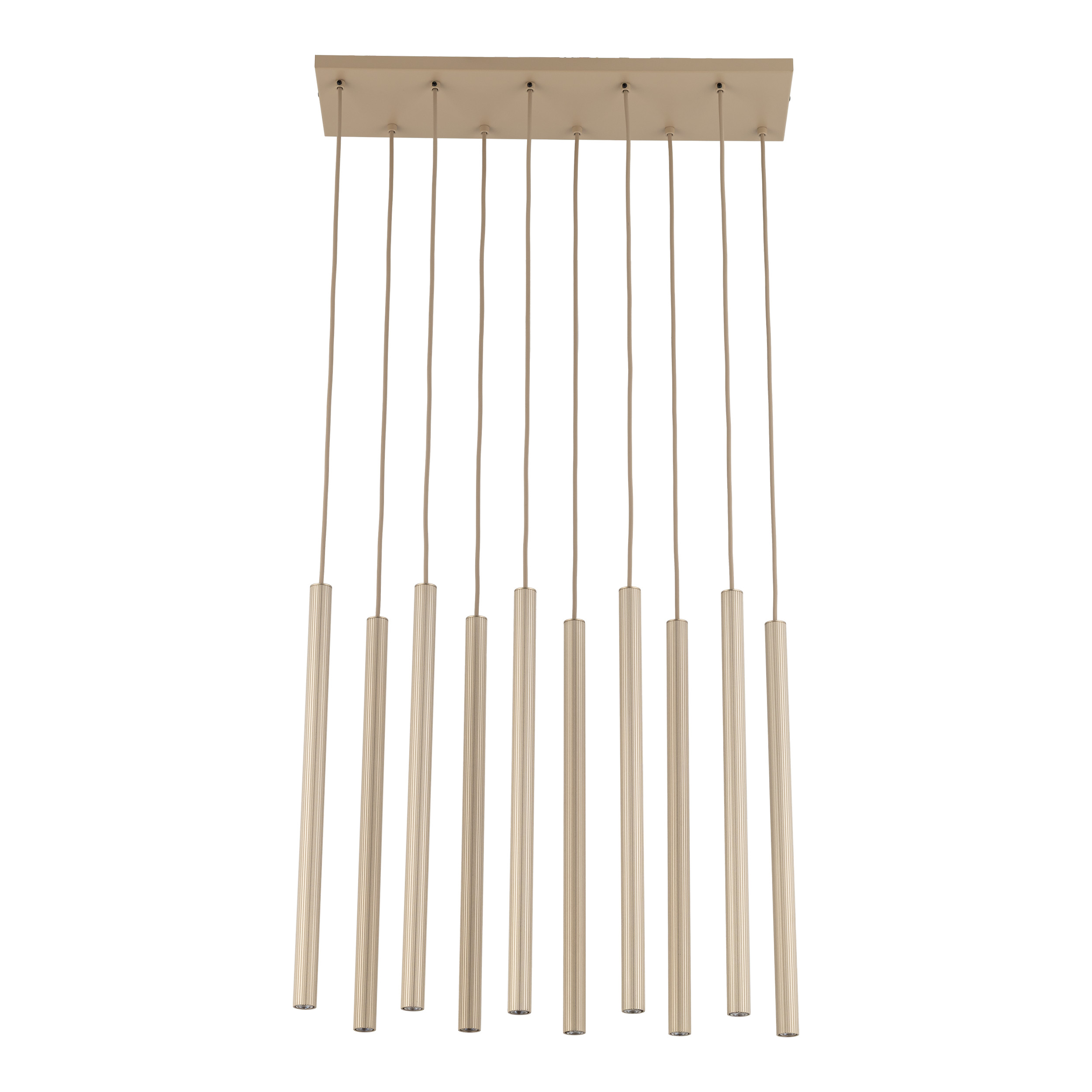 Висящата лампа FERRO SABIA CHAMPAGNE е впечатляващо осветително тяло с модерен дизайн и силно декоративно присъствие. Композицията от десет цилиндрични висящи тела, разположени върху правоъгълна основа, създава стилен визуален ефект и превръща лампата в централен акцент за всяко помещение. Подходяща е за трапезарии, кухненски острови, дневни, хотелски пространства, ресторанти и представителни интериори.