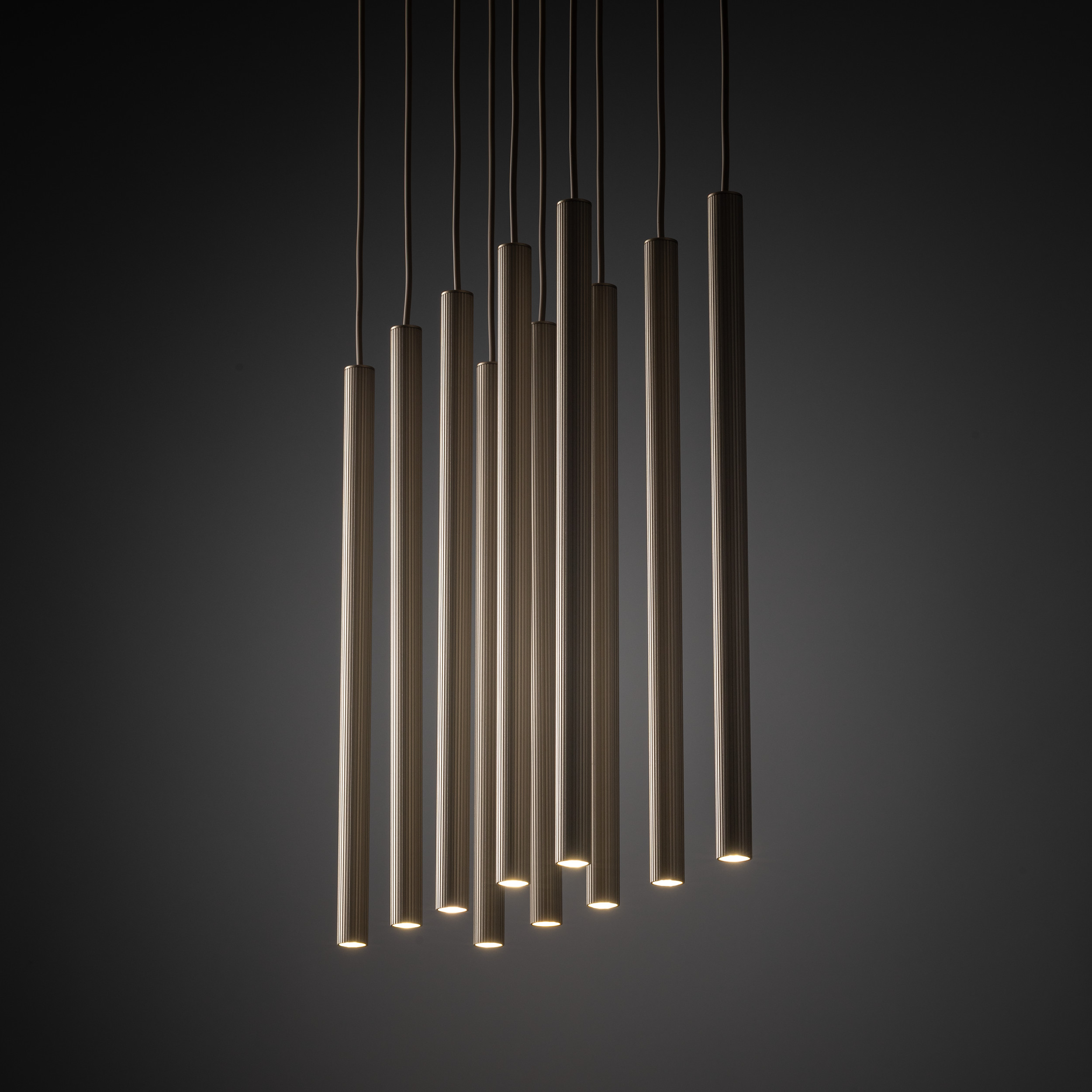 Изработена е от алуминий, кабел, боядисана стомана и пластмаса, което осигурява здравина и дълготрайност. Лампата разполага с 10 фасунги G9 и позволява използването на LED крушки с максимална мощност до 8W всяка.
