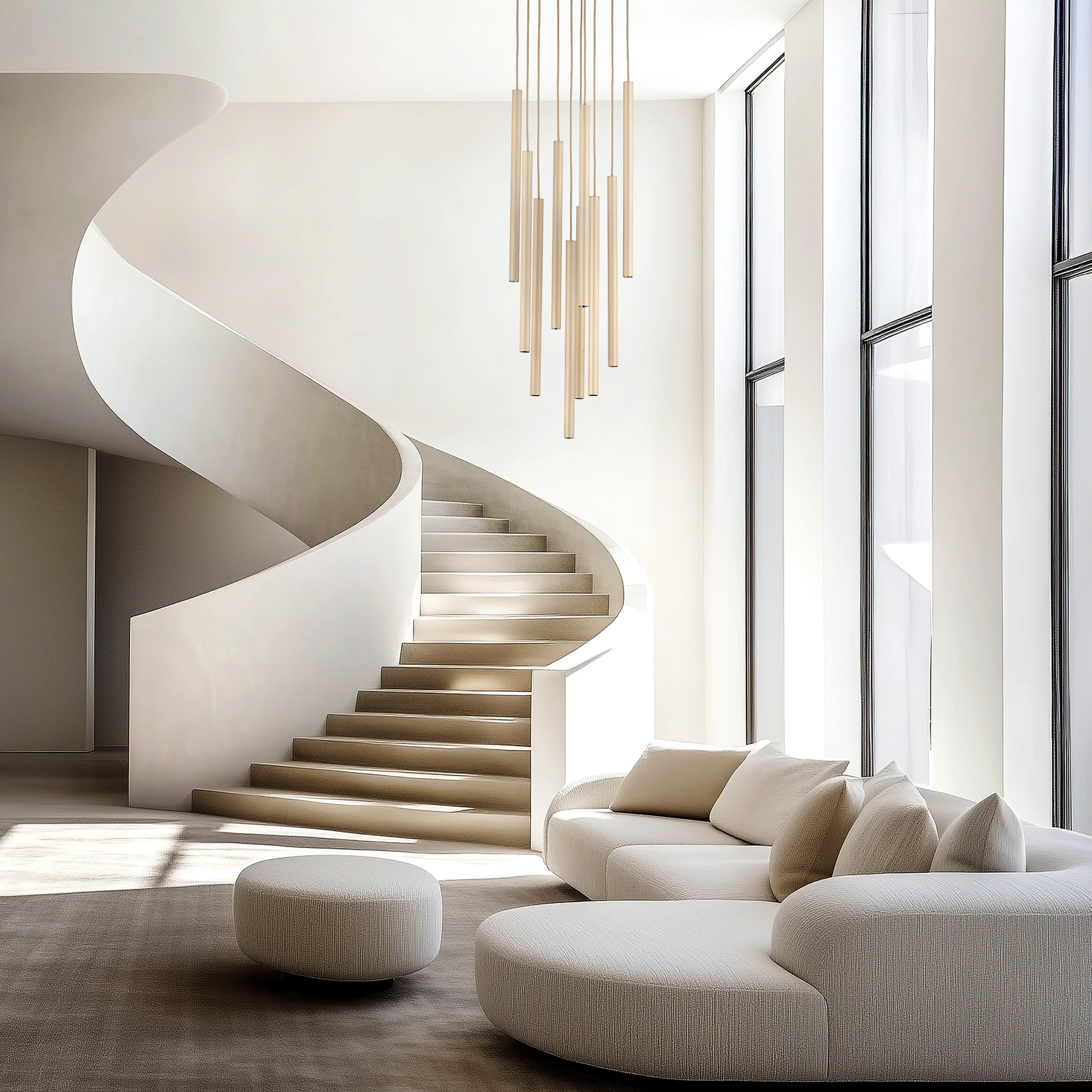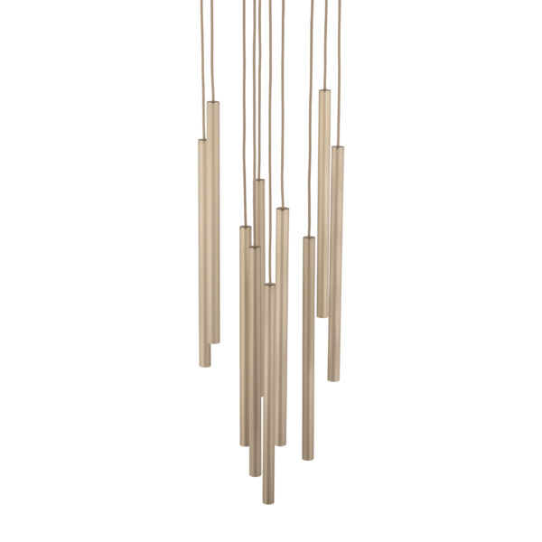 Висящата лампа FERRO SABIA CHAMPAGNE е стилно осветително тяло с модерен дизайн и впечатляваща визия. Композицията от десет цилиндрични висящи тела на различни височини създава елегантен акцент в интериора. Подходяща е за дневни, трапезарии, стълбища, хотелски пространства, ресторанти и представителни зони.