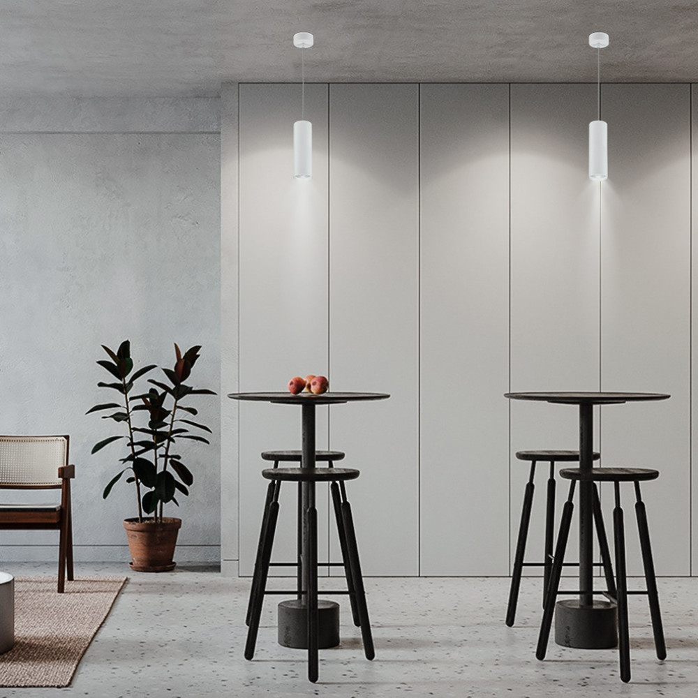 Елегантна висяща лампа LAMBARIO LH07-50200 с цилиндрично алуминиево тяло в бял цвят. Работи с крушка GU10 и е подходяща за осветяване на кухни, трапезарии, коридори и търговски пространства.