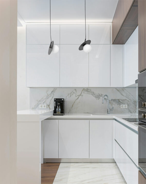 Висяща лампа KAJA SANTE K-5370 е стилно и модерно осветително тяло, съчетаващо черен метален елемент с бяло стъклено кълбо. Минималистичната форма я прави подходяща за съвременни интериори – всекидневна, спалня, трапезария, коридор или офис пространство.