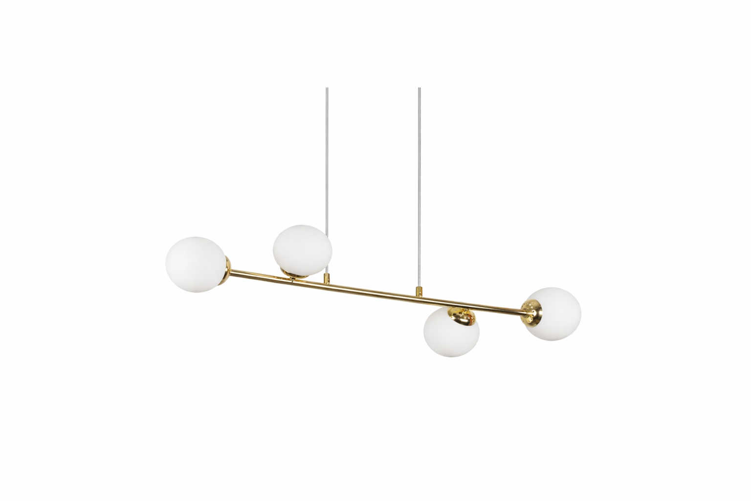 Елегантна висяща лампа MILO GOLD с четири стъклени сфери и златни метални елементи. Дизайнът съчетава модерна визия и класическа елегантност, като създава мека и приятна светлина. Подходяща е за хол, трапезария, кухня или спалня.