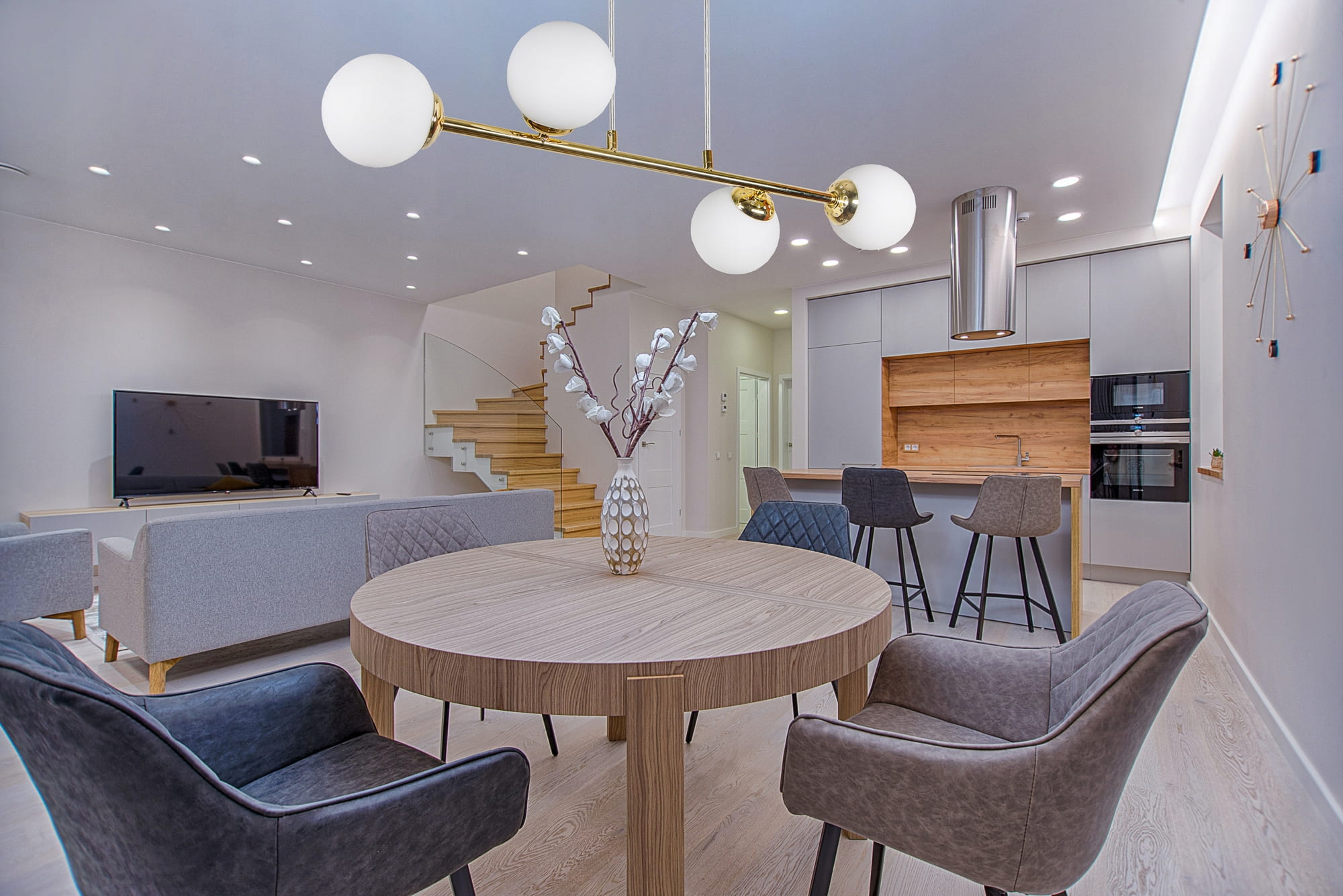 Простата форма на стъклените сфери придава стил и универсалност, което прави осветителното тяло подходящо за различни пространства – хол, трапезария, спалня или кухня. Висококачественото стъкло и металните елементи със златисто покритие създават хармонична комбинация между модерна визия и класическа елегантност.
