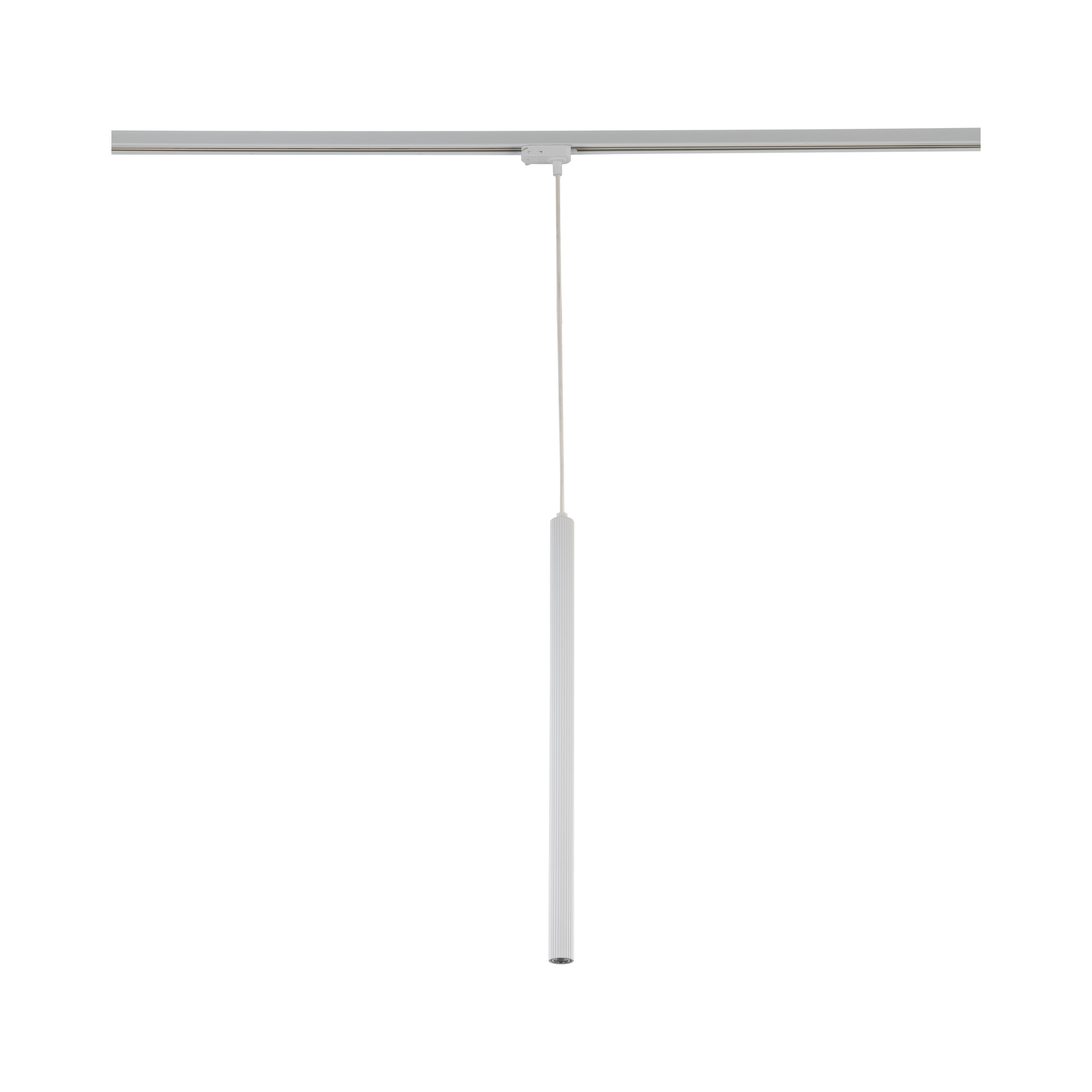 Модерна висяща лампа за трифазна релсова система с изчистен цилиндричен дизайн в бял цвят. Подходяща за съвременни, минималистични и loft интериори.