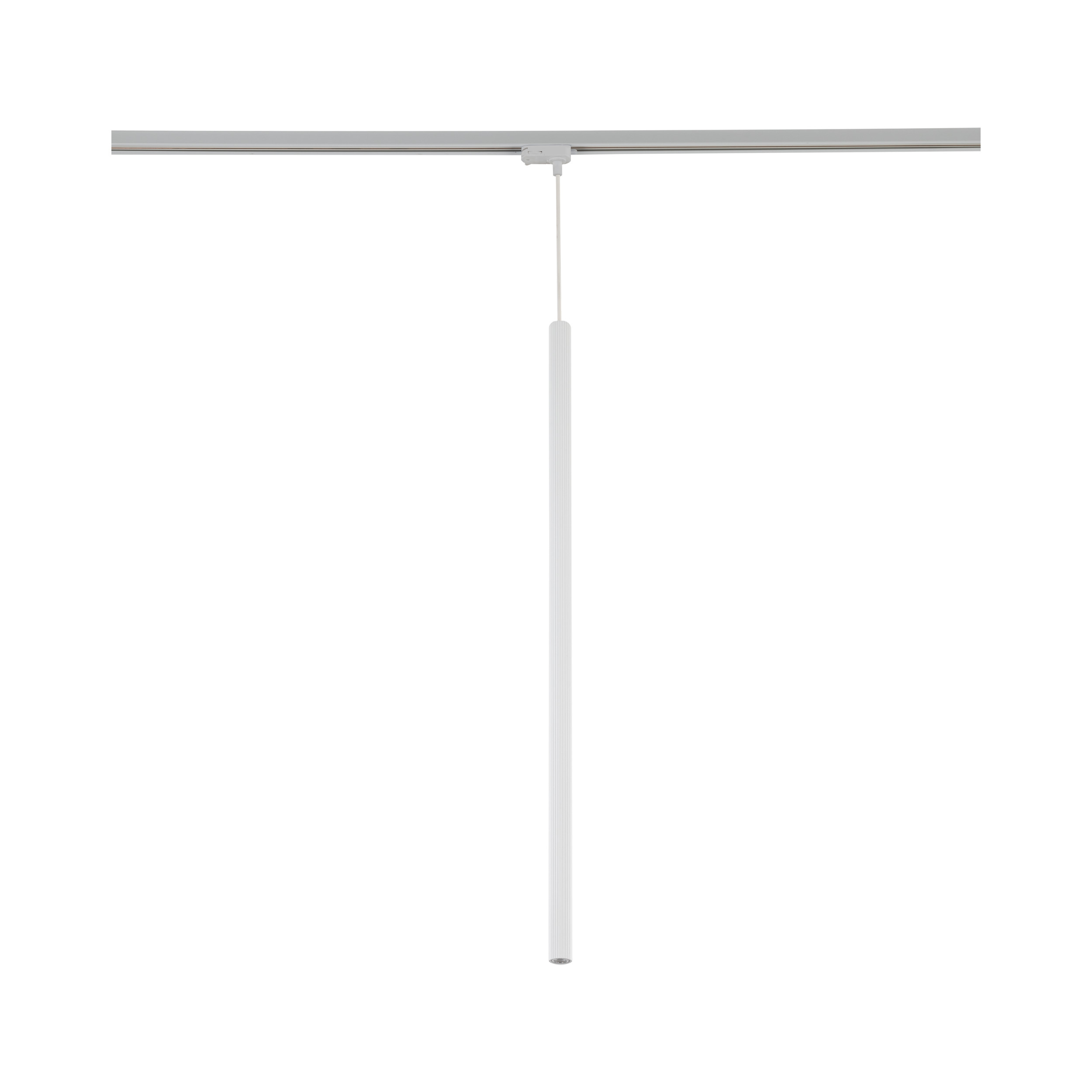 Стилна висяща лампа за трифазна релсова система с минималистичен цилиндричен дизайн в бял цвят. Подходяща за модерни, скандинавски и loft интериори.