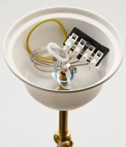 Конструкцията на осветителното тяло е изработена от висококачествен метал и месинг, осигуряващи здравина и дълготрайност. Тези материали гарантират стабилност и устойчивост на ежедневна употреба, както и лесна поддръжка.