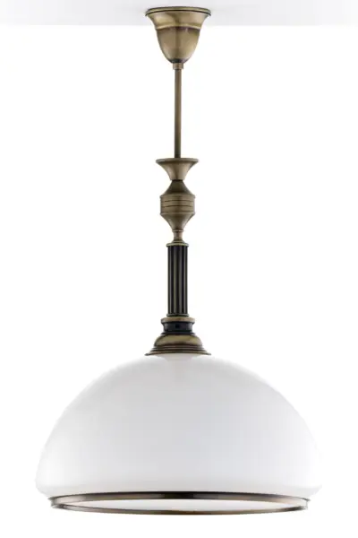 Корпусът на осветителното тяло е изработен от висококачествен метал с месингов завършек, който придава изискан и топъл визуален ефект. Абажурът е от стъкло, което осигурява равномерно разпръскване на светлината и приятна атмосфера.